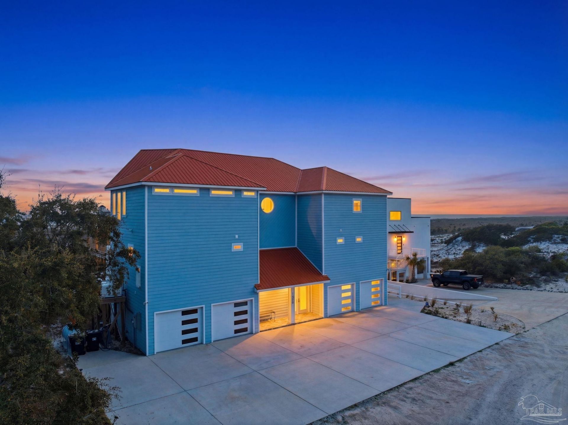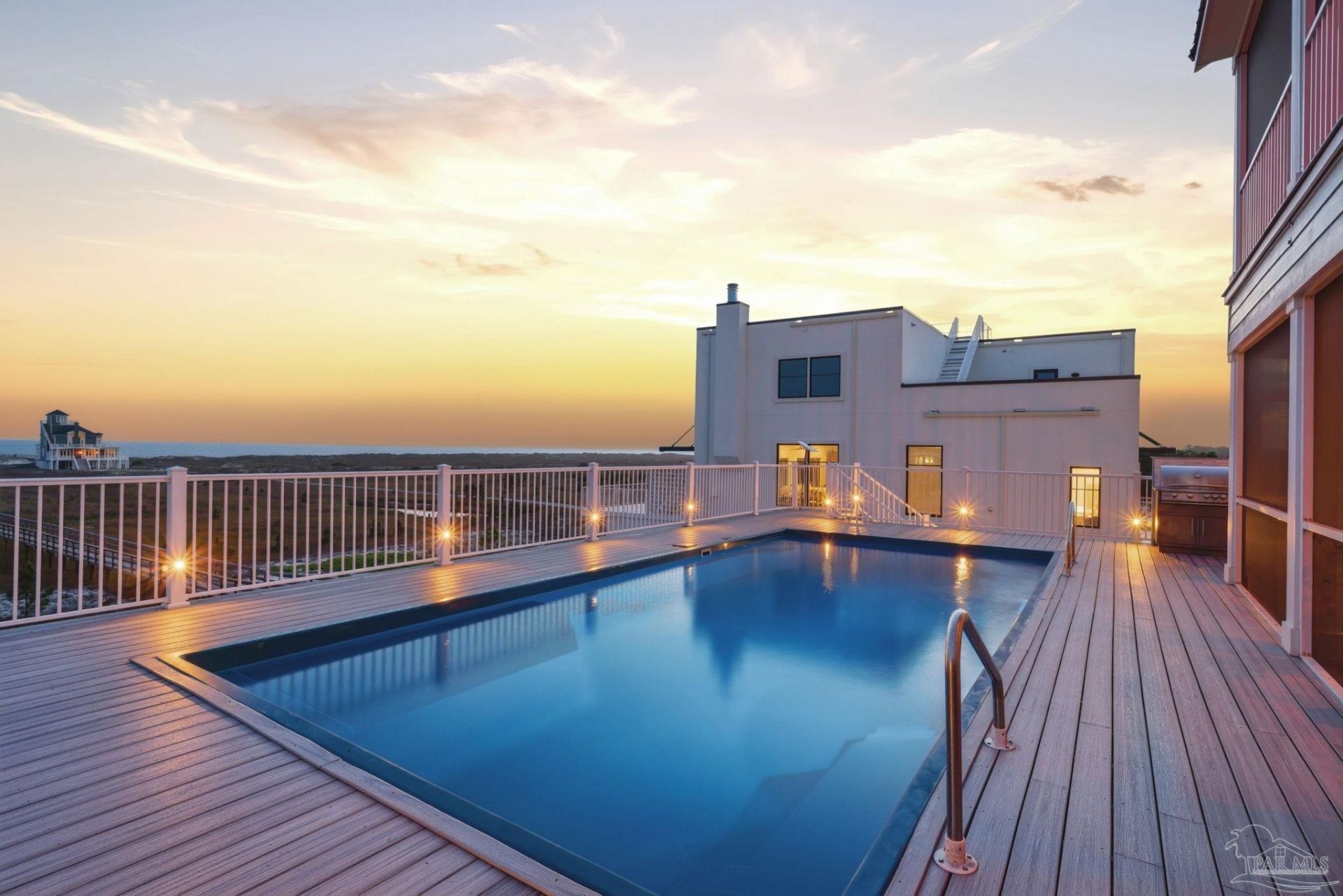 Built in 2023, this custom 5BR, 5.5BA Gulf-front residence offers 3,632sf of thoughtfully designed living space, with 2,200sf of screened porches that extend the living experience outdoors. Spanning approximately 4 acres with 100 feet of prime beachfront, this residence delivers a rare combination of artistry, privacy, & direct Gulf frontage. Every element of this home reflects intentional design & construction, from its trapezoid layout that maximizes views to the structural integrity of pilings driven approximately 20' deep. Kitchen is equipped with Sub-Zero freezer/refrigerator, double ovens, 2 Bosch dishwashers, convection/steam ovens & custom cabinetry paired with quartz surfaces, custom tile, & lighting selections unique to the custom build. An open living space features vaulted ceilings, while each bedroom offers its own private retreat. A work of art - a bedroom suite showcases a round soaking tub that is a statement piece with custom tile with artistic touches through out. Primary suite offers Gulf views, fireplace & spa-like tub with built-in heater & bubbler for luxury retreat! Highlights include 2 laundry rooms, self-flushing toilets, elevator servicing all levels, & 4-car garage. Outdoor living is just as impressive, designed for both relaxation & entertaining. Enjoy a chilled/heated 30x15 pool, separate hot tub, & a fully equipped outdoor kitchen with grill & cooktop. A private boardwalk, approximately 1,000' in length & 7' wide with 6' clearance, allows for golf cart access as it leads you directly to the Gulf, offering a seamless connection to the shoreline. Home features a whole-house generator & Gold Fortified designation, all working together to provide peace of mind. Here, the surroundings open up to uninterrupted Gulf views, wide stretches of sugar-white sand, & a sense of privacy that defines this stretch of coastline at the end of Fort Morgan just before the park, nearby boat ramps and miles of biking and walking trails.