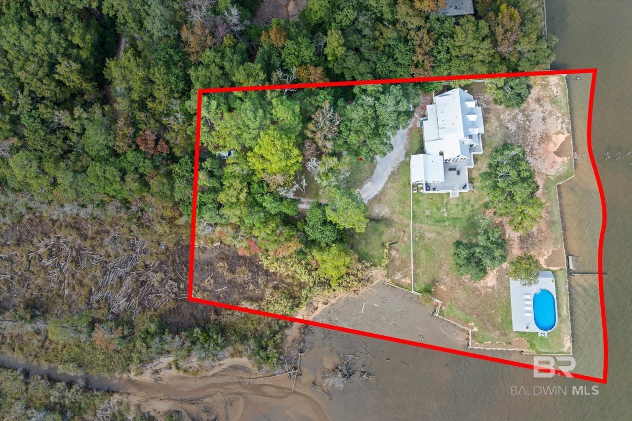 Welcome home to this stunning 4-bed/3-bath Southern Coastal Farmhouse, perfectly situated on approx. 2 acres with 267 feet of waterfront along beautiful Mobile Bay. The seawall was fully restored just a few years ago, offering peace of mind and lasting stability for years to come.Designed for comfort and timeless style, this home welcomes you with a chef's dream kitchen featuring a built-in 8-burner Wolf range with pot filler, two dishwashers, ice maker, microwave, and abundant storage, including both a large pantry and a hidden butler's pantry/workshop.The main floor boasts a new primary en-suite just off the dining room that has private entry to the deck, where both spaces offer unobstructed views of Mobile Bay. The open-concept living and dining areas are bright and airy, with large picture windows and skylights ideal for astonishing views. A second en-suite on the main level adds versatility and comfort for family or guests.Upstairs, you'll find 2 spacious bedrooms connected by a Jack-n-Jill bath, a separate living/recreation room, and a bonus room/office, perfect for working from home or creating a cozy getaway.Step outside to enjoy quiet mornings and breathtaking sunsets or sunrises from the covered front porch, expansive deck, or the detached, decked swimming pool (4 years old, with a new liner installed this summer), all offering panoramic bay views surrounded by mature trees and natural beauty.With its 5yr-old metal roof, classic dormers, and inviting porch, this property blends modern farmhouse elegance with Southern coastal charm. creating a truly exceptional waterfront retreat.Buyer/buyer's agent to verify all information deemed important during the due diligence period. Buyer to verify all information during due diligence.