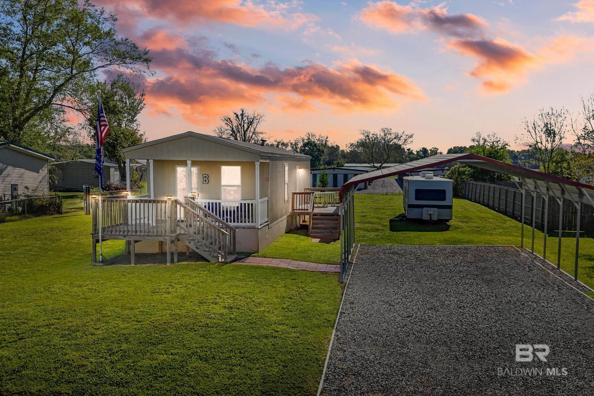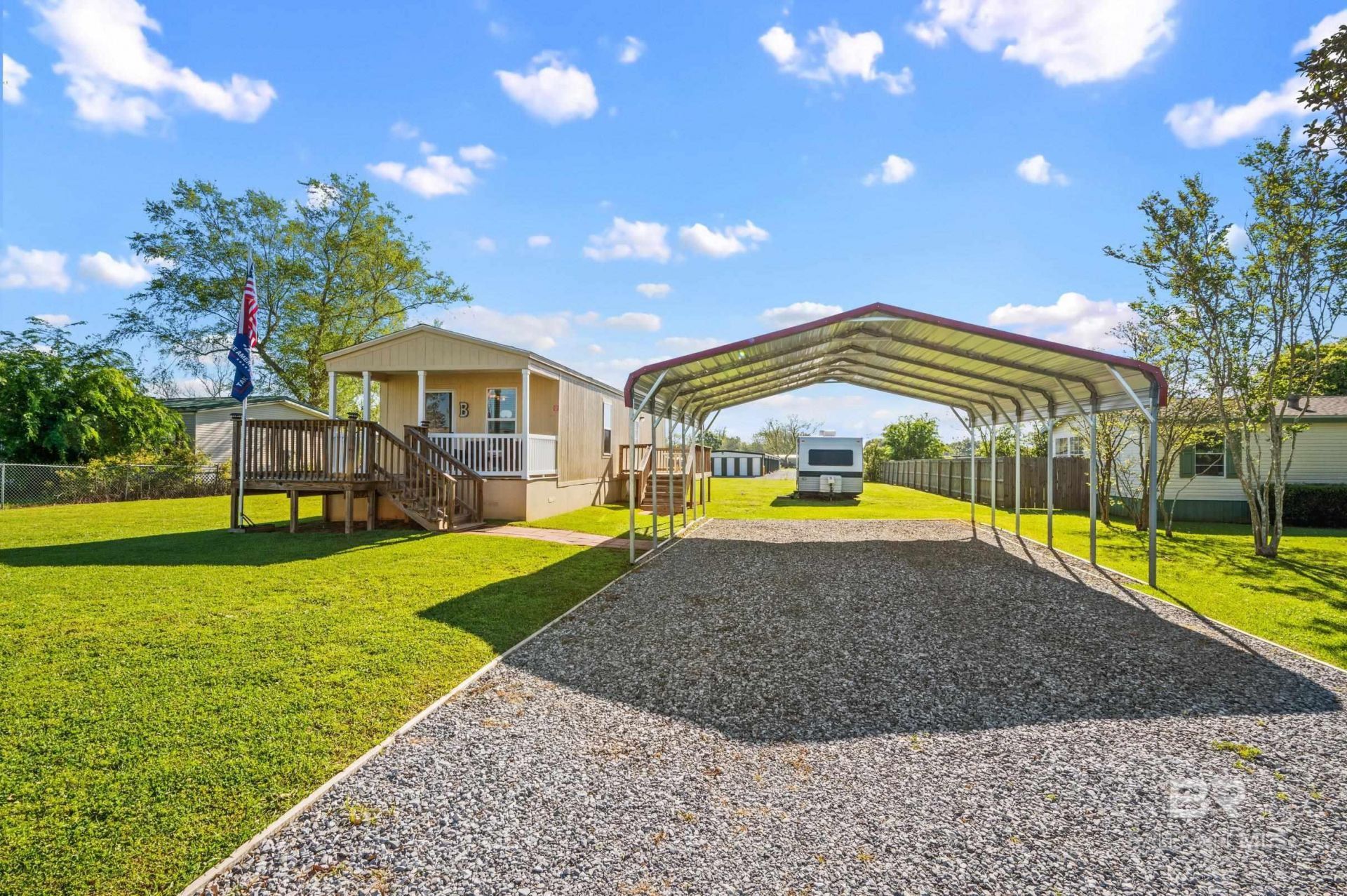Looking for a peaceful retreat that's move-in ready? This immaculate 2 bedroom, 1 bath home is the perfect blend of comfort and practicality; PLUS you own the land! Nestled on .37 acres, this 16x50 home features durable Hardie board siding and skirting, a 22x26 metal carport, and a 16x16 front deck (plus an 8x8 extension) Perfect for your morning coffee or evening gatherings. The 8x16 back deck offers space for cookouts and relaxing weekends. Two storage sheds (8x16 barn-style and 6x6) give you plenty of room for hobbies or tools, and the RV hookup makes hosting easy. The crawlspace has been encapsulated with 6 mil plastic sheeting, and a new refrigerator was installed this year. Located just minutes from Point Clear, you'll enjoy the convenience of nearby shops and restaurants while still savoring quiet country living! No HOA fees, no restrictions, and low maintenance! Come see why this home shines above the rest! Affordable, Adorable, and ready for you to move right in. Buyer to verify all information during due diligence.